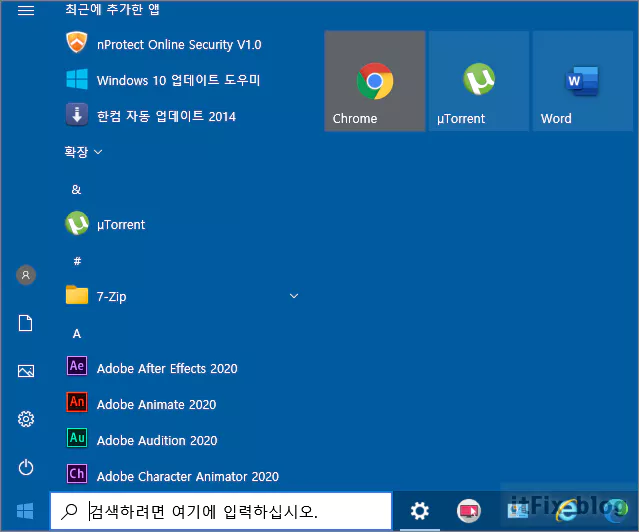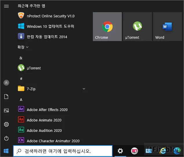 아래의 이미지는 시작 메뉴의 색상을 원래대로 돌린 다음의 모습입니다. 제 경우에는 윈도우 색상 모드를 어둡게로 선택해 둔 결과 주로 검은색 계열의 이미지로 복원되었습니다.