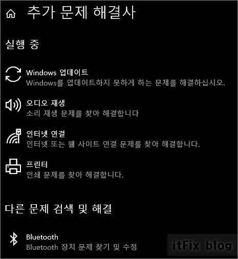 '윈도우 설정 > 업데이트 및 보안 > 문제 해결 > 추가 문제 해결사' 경로로 들어가 보면 많은 종류의 문제 해결사들이 있는 데 가장 위쪽의 윈도우 업데이트 문제 해결사부터 시작해서 거의 모든 문제 해결사를 실행해 보는 것입니다.