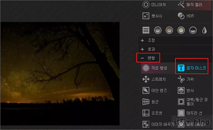 포토스케이프에서 샘플 파일을 불러온 다음 우측 메뉴의 변형의 더하기 표시를 눌러 하위 메뉴를 연 다음 문자 마스크를 클릭합니다.