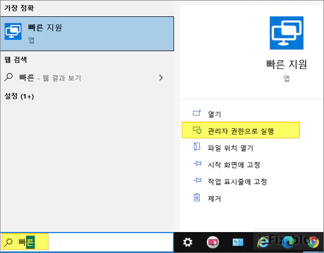 윈도우 작업 표시줄의 검색 상자에 빠른 지원이라고 입력한 다음 관리자 권한으로 실행합니다.