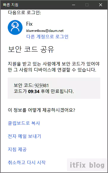 가족이나 친구등 지원을 받기로 한 사람에게 지원을 줄 사람은 빠른 지원을 실행한 다음 하단의 다른 사람 지원 버튼을 눌러 자신의 MS 계정으로 로그인합니다. 그러면 아래의 이미지와 같은 빠른 지원 코드가 MS로부터 부여됩니다.