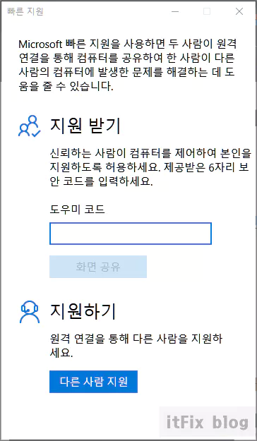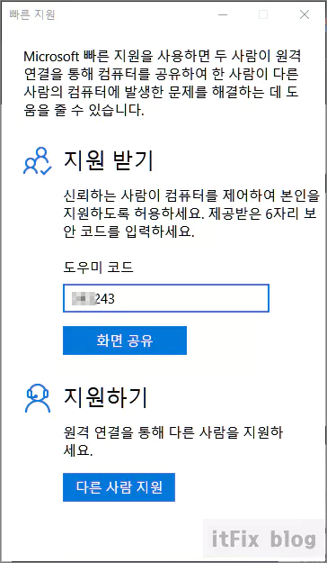 지원을 받을 사람 역시 빠른 지원을 실행한 다음 지원을 줄 사람으로부터 받은 도우미 코드를 입력합니다.