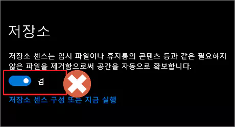 저장소 센스 기능은 윈도우 설정 > 시스템 > 저장소 경로로 진입한 다음 저장소 센스 기능을 끄면 됩니다.