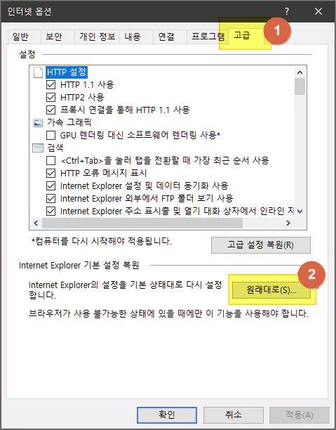 익스플로러 브라우저 우측 상단의 톱니바퀴 아이콘을 클릭한 다음 인터넷 옵션을 클릭합니다. 다음으로 고급 탭에서 하단에 있는 원래대로 버튼을 클릭한 다음 적용을 누릅니다.