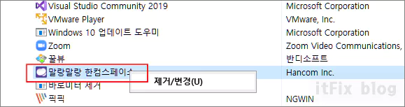 제어판을 열고 프로그램 제거 또는 변경으로 들어간 다음 설치된 프로그램 목록에서 말랑말랑 한컴 스페이스를 마우스 우클릭하여 제거할 수 있습니다. 이렇게 하면 작업 표시줄의 알림 영역에 들어가 있던 한컴 스페이스 아이콘이 자동 종료되면서 파일 탐색기에 나타나던 동기화 중인 한컴 스페이스 앱도 제거됩니다.
