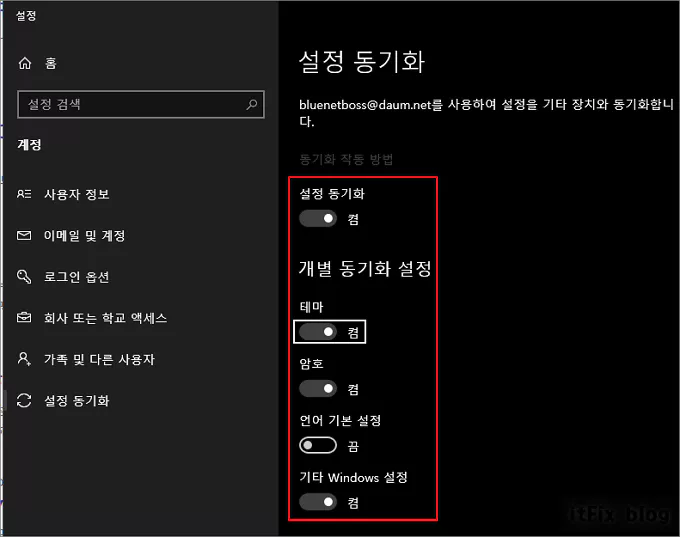 현재 PC의 윈도우에 로그인하는 계정이 고대비를 사용 중인 다른 기기와 설정 동기화 중이 아닌지 검토해 보시기 바랍니다. 이와 같은 경우에는 현재 PC에서 고대비 기능을 제거하더라도 설정 동기화 중인 다른 기기에서 설정이나 테마를 동기화한 경우 이 영향에 의해 현재 PC의 고대비 기능 해제가 제대로 적용되지 않을 수 있습니다.