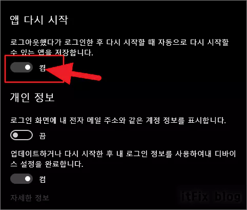 여기서 '앱 다시 시작'이라는 항목에 있는 "로그아웃했다가 로그인한 후 다시 시작할 때 자동으로 다시 시작할 수 있는 앱을 저장합니다"라는 옵션을 꺼두면 됩니다.