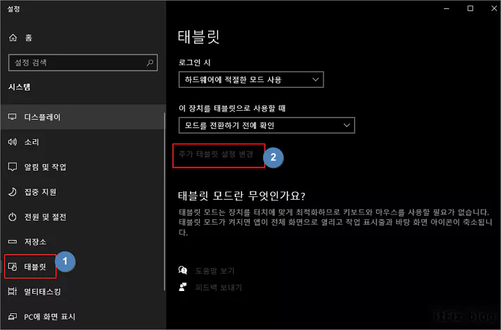 그다음 오른쪽 창에서 '추가 태블릿 설정 변경'을 클릭합니다. 만일, 앞으로 전혀 태블릿 모드를 사용할 일이 없다면 여기서 위쪽에 있는 로그인 시 항목에서 '태블릿 모드 사용 안 함'을 선택하게 되면 태블릿 모드로의 변경을 방지할 수 있습니다.