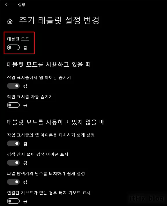 아래의 이미지에서와 같이 '추가 태블릿 설정 변경' 페이지에서는 단발적인 태블릿 모드의 켜고 끔을 설정하거나, 태블릿 모드와 관련된 설정들을 변경할 수 있습니다.