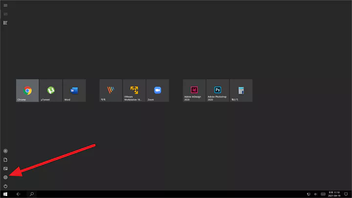 작업 표시줄의 고정 아이콘들이 모두 사라지고 바탕화면 아이콘이 아닌 윈도우 시작 버튼의 확장 그룹에 고정되어 있던 아이콘들 몇 개만 나타나게 됩니다. 아직 마우스 커서가 살아 있다면 좌측 시작 버튼 위쪽의 윈도우 설정을 클릭합니다.