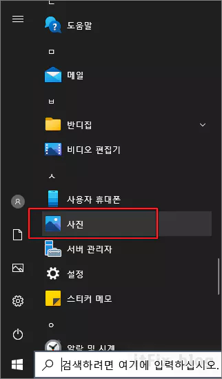 사진 앱의 위치는 윈도우 시작 버튼을 누르고 아래로 내리면 보입니다.