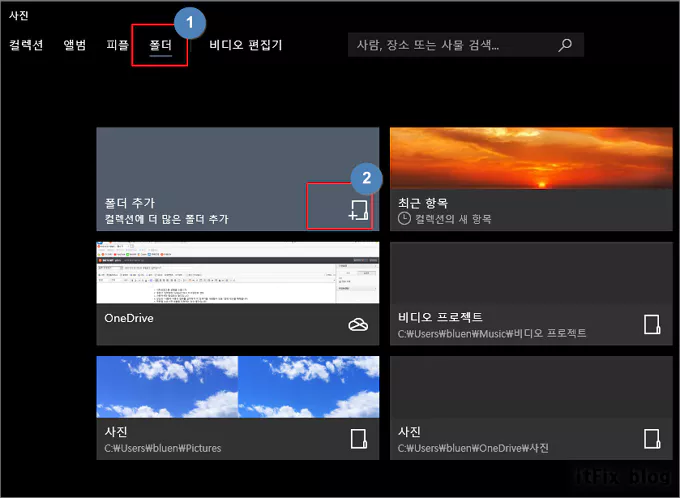 사진 앱의 상단 메뉴에서 폴더를 누른 다음 PDF로 변환할 이미지들을 모아둔 폴더가 보이지 않을 경우에는 폴더 추가를 눌러 사진 앱의 폴더로 추가해 줍니다.