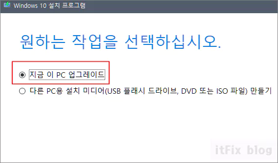 다운로드한 도구 파일을 실행한 다음 설치 및 사용에 동의 버튼을 눌러 줍니다. 이후 몇 가지 항목을 준비하는 중이라는 창이 뜨고 난 다음 지금 이 PC 업그레이드를 선택하고 진행합니다.