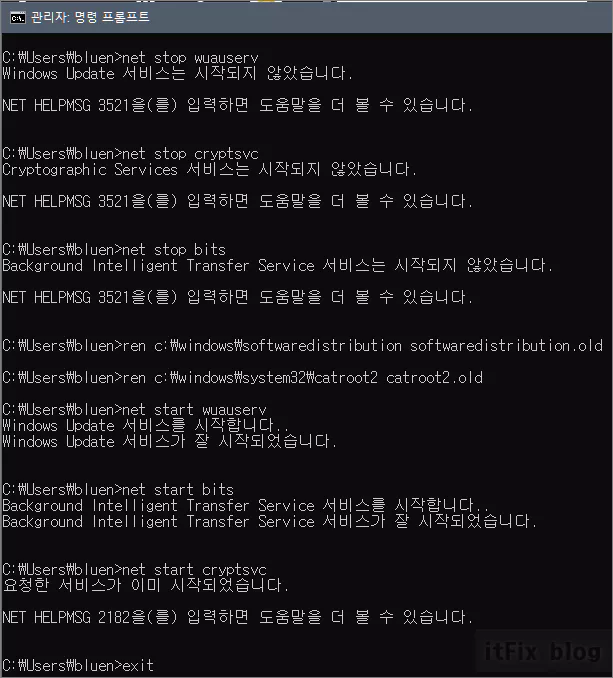 net stop 입력도중 윈도우 업데이트 서비스가 시작되지 않았다는 메시지가 나온다면 해당 서비스를 중지시키는 절차이므로 다음 단계로 넘어가면 됩니다.