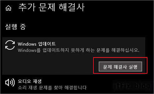 설정 > 업데이트 및 보안 > 문제 해결 > 추가 문제 해결사 > Windows 업데이트 > 문제 해결사 실행 버튼을 눌러 줍니다.