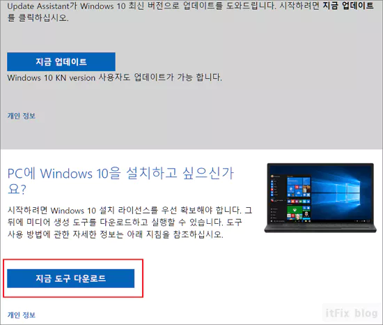그다음 지금 업데이트와 지금 도구 다운로드 두 개의 버튼 중 아래쪽에 있는 지금 도구 다운로드를 눌러 도구를 다운로드합니다.