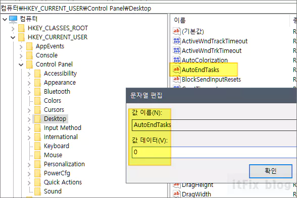 만일, 저장해야 할 작업이 있는 데도 불구하고 실수로 윈도우 종료 버튼을 클릭하면 그대로 데이터가 사라지면서 종료되는 경우에는 레지스트리 편집기에서 AutoEndTasks 키를 만들어 값을 0으로 만들어 주면 됩니다.