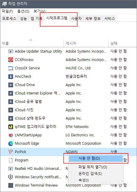 그다음으로 시작 프로그램 탭을 선택한 다음 Audio Driver 및 Windows Security notification 두 가지 정도만 사용으로 놔두고 나머지는 모두 마우스 우클릭 후 사용 안 함으로 설정하시는 것을 추천해 드립니다.