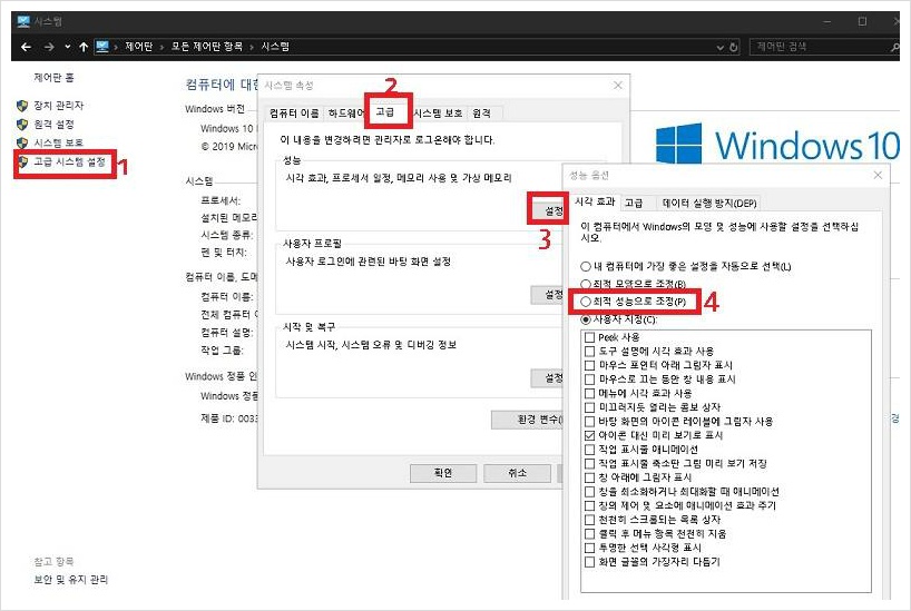 제어판에서 시스템을 누르고 들어간 뒤 고급 시스템 설정을 누르고 고급 탭에서 성능 항목의 설정을 누릅니다.