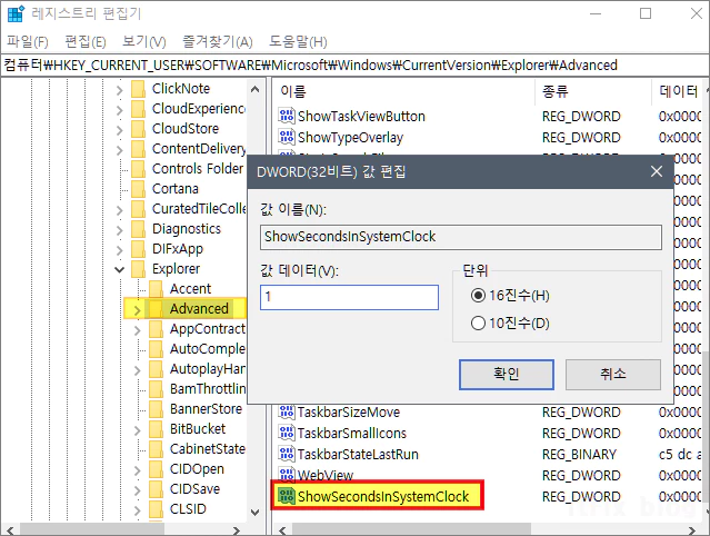 새 값의 이름을 ShowSecondsInSystemClock이라고 이름을 지어 줍니다. 그다음으로 ShowSecondsinSytemClock를 더블 클릭한 다음 값을 1로 지정해 줍니다.