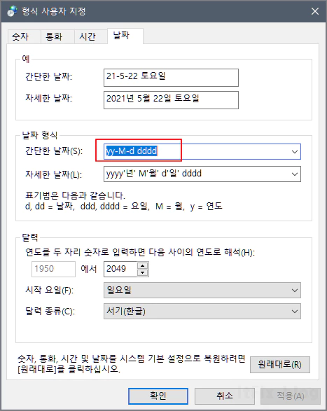 3. 형식 사용자 지정 창이 뜨면 날짜 탭을 선택한 다음 기본으로 되어 있는 간단한 날짜 형식인 yyyy-MM-dd를 yy-M-d ddd로 변경한 다음 적용 및 확인을 눌러 줍니다.