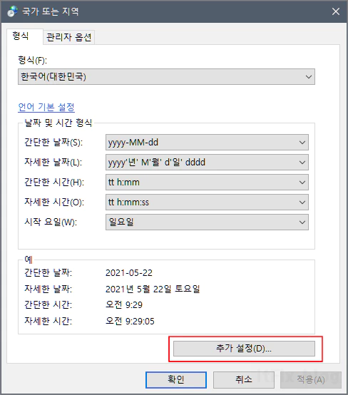 2. 국가 또는 지역 창이 뜨면 하단의 추가 설정 버튼을 클릭합니다.