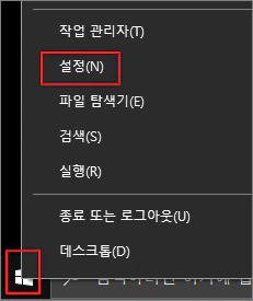 ① 윈도우 설정을 엽니다. 윈도우 설정은 작업 표시줄의 가장 왼쪽의 시작 버튼을 마우스 우클릭하면 볼 수 있습니다.
