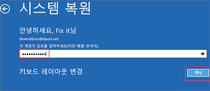 ⑥ 윈도우 계정 로그인 암호를 입력하고 우측 하단의 계속 버튼을 클릭합니다.
