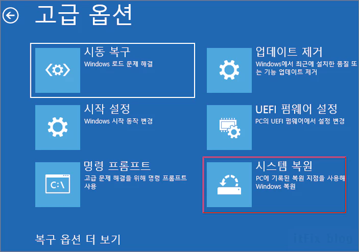 ④ 다음의 고급 옵션 화면에서 시스템 복원을 클릭합니다.