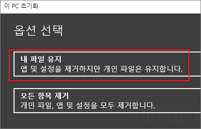 ⑤ '내 파일 유지'를 클릭합니다. 이 단계에서 만일 오류가 심각하고 깨끗한 초기화를 원한다면 '모든 항목 제거'를 선택할 수도 있습니다. 다만, 이 경우에는 개인 파일이나 앱 및 설정이 모두 제거되고 초기화되므로 신중히 선택하시기 바랍니다.