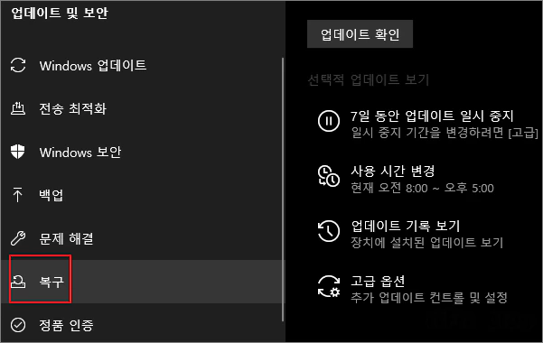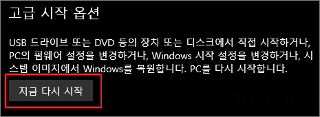 ① 윈도우 설정 > 업데이트 및 보안 > 복구 > 고급 시작 옵션의 지금 다시 시작 버튼을 눌러 줍니다.