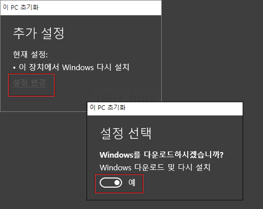 ⑦ 로컬 다시 설치 다음에 나타나는 화면에서 클라우드 설치 경우와 마찬가지로 깨끗한 윈도우즈를 사용하여 초기화 하고 싶다면 설정 변경 링크를 눌러 윈도우즈 다운로드 및 다시 설치를 예로 선택해 주면 됩니다.