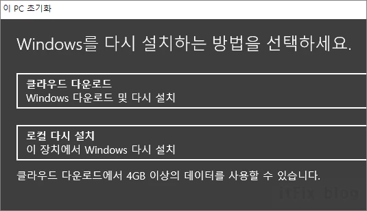 ⑥ 클라우드 또는 로컬 선택 후 초기화를 계속 진행합니다. 어느 것을 선택하더라도 결과는 동일합니다. 클라우드 설치는 마이크로소프트의 웹 드라이브에서 직접 다운로드하므로 이 역시 별도의 매체가 필요 없는 안전한 방법이나 로컬 설치보다는 시간이 더 소요될 수 있습니다. 잘 모르겠으면 로컬 다시 설치를 누르시기 바랍니다.