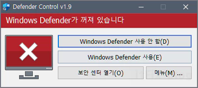 이때, Defender Control의 메뉴에 있는 윈도우 디펜더 설정을 통해 상태를 살펴보면 꺼져 있는 것을 확인할 수 있습니다.