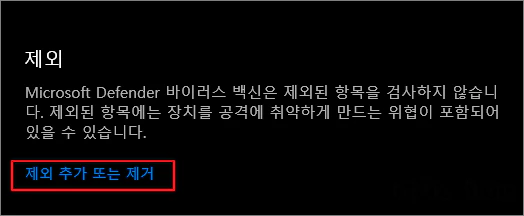 설정 관리로 들어간 다음 제외 추가 또는 제거를 클릭합니다.