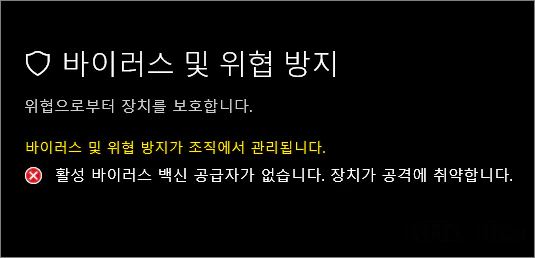윈도우 설정 > 업데이트 및 보안 > Windows 보안 > Windows 보안 열기 > 바이러스 및 위협 방지 > 바이러스 및 위협 방지 설정의 설정 관리를 클릭합니다.