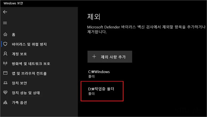 예를 들어 D드라이브의 작업중이라는 폴더 아래에 다운로드 한 다음 압축을 풀었다고 가정할 경우에 원활한 사용을 위해 압축을 해제하여 생성된 폴더가 아닌 한 단계 위의 상위 폴더인 작업중이라는 폴더 자체를 제외시켜 줍니다.