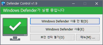 다시 위의 이미지에서 처럼 비정상적으로 디펜더가 작동하지 않거나 정지되어 있는 경우에는 Defender Control 프로그램을 연 다음 Window Defender 사용 버튼을 한 번만 클릭해 주면 다시 정상으로 돌아옵니다.