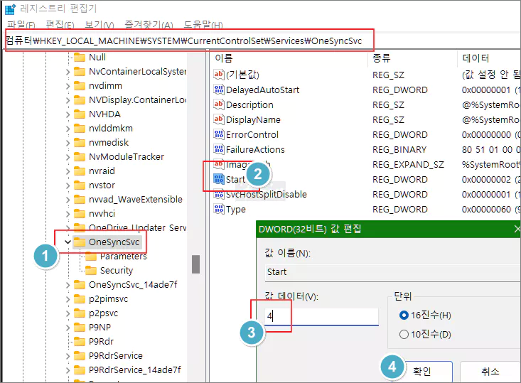 그런 다음 OneSyncSvc 폴더내의 Start 값을 4로 수정해주고 확인을 눌러 줍니다.
