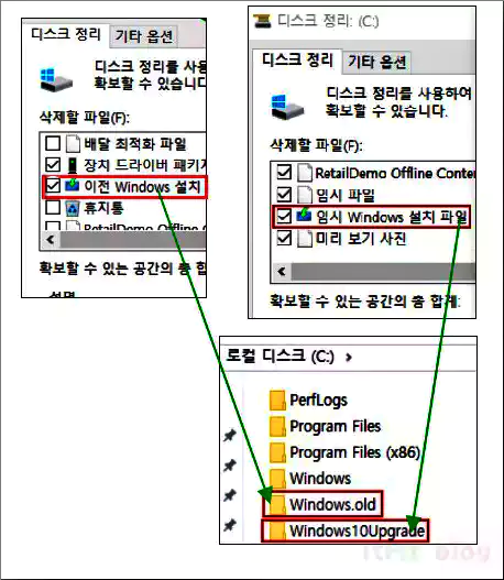 따라서, 공간 확보의 측면에서 두개의 폴더들은 모두 정리해 주는 것이 좋습니다. 이 두 폴더를 제거하기 위해서는 제어판에서 보이는 경우에는 제어판에서 바로 제거해도 되고 C 드라이브의 디스크 정리를 수행한 다음 삭제할 파일 목록에 보이는 '이전 Windows 설치' 및 '임시 Windows 설치 파일'이라는 목록을 제거하면 됩니다.
