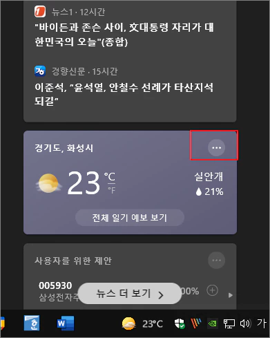 날씨 표시에 마우스를 올려 두거나 클릭하면 팝업으로 뉴스와 날씨 창이 나타나게 됩니다.