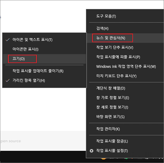 겹침 등의 알림 영역 오류는 뉴스 및 관심사를 끄기하거나 또는 아이콘만 표시로 설정하면 대부분 정상적으로 돌아온다고 합니다.