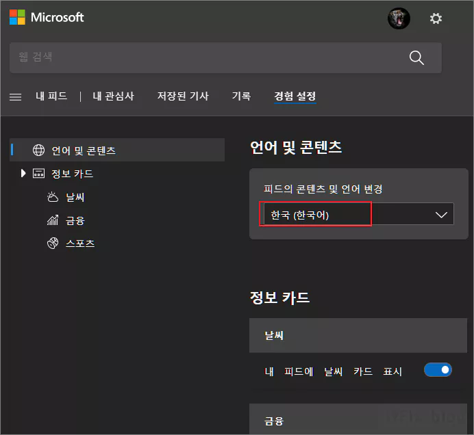 '자세한 설정'을 클릭하면 엣지 브라우저에서 언어 및 콘텐츠의 언어 변경 페이지를 열어 줍니다. 이 페이지에서 '피드의 콘텐츠 및 언어 변경' 항목에 있는 언어를 '한국(한국어)'로 지정해 줍니다.