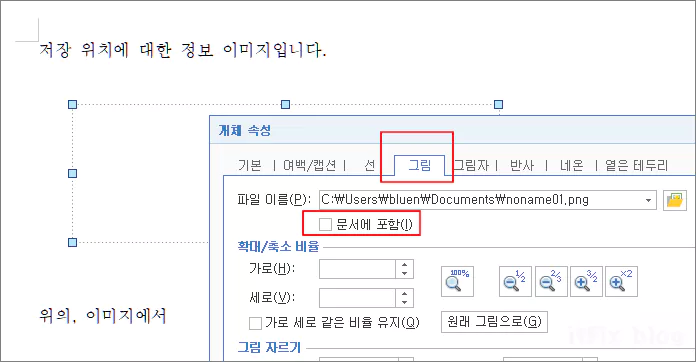 개체 속성 창에서 그림 탭을 선택한 다음 파일 이름 부분에서 이미지의 경로를 다시 지정해 주고, 바로 아래에 있는 '문서에 포함' 옵션을 클릭해 체크 표시를 해 주어야 이미지가 문서 자체의 일부로 저장됩니다. 이렇게 되면 경로에 파일이 존재하던 존재하지 않던 전혀 문제 되지 않습니다.
