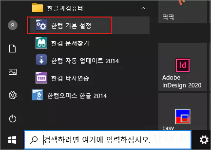 윈도우 시작 버튼을 누르고 설치된 한글 폴더로 이동하면 '한컴 기본 설정'이라는 버튼이 보입니다.