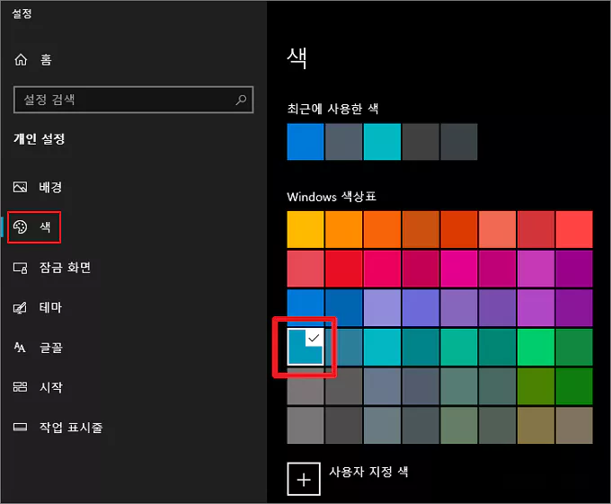 색상을 검은색으로 바꿔 보기 위해 바탕화면에서 마우스 우클릭한 다음 개인 설정을 클릭해 줍니다. 그렇게 한 다음 윈도우 개인 설정 메뉴에서 색을 선택하고 우측란의 색상표를 보면 제가 기본색으로 하늘색을 지정해 사용 중이라는 상황이 보입니다.