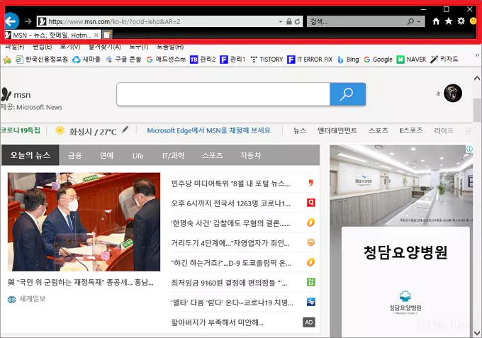 아래의 이미지는 붉은색으로 변경해 본 모습입니다. 위에서 살펴본 바와 같이 인터넷 익스플로러 브라우저는 앱 자체적으로 색상을 변경하는 기능은 없지만, 윈도우 기본 색상에 종속되어 윈도우 기본 설정 색상이 변경되면 이에 따라 동일한 색상으로 자동 변경됩니다.