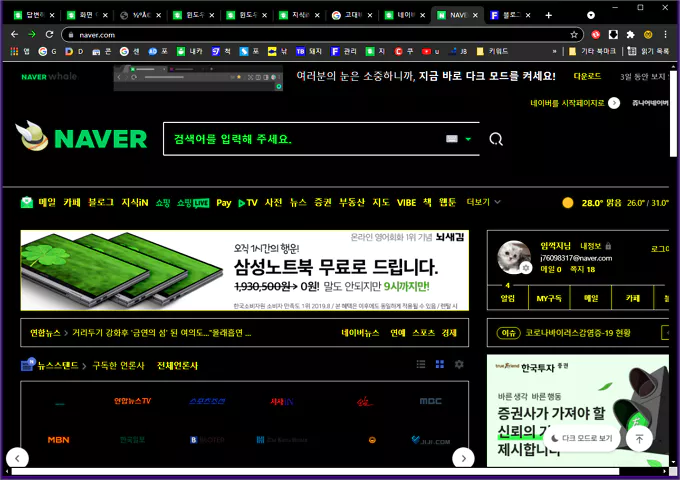 대략 고대비가 켜지게 되면 구글 크롬에서 네이버 메인 화면에 접속했을 때, 아래와 같은 모습이 됩니다.