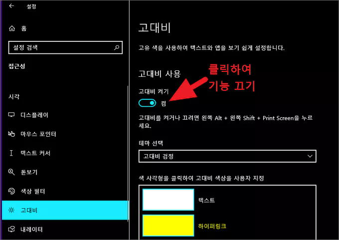 위의 경로로 진입한 다음 직접 마우스로 클릭해 고대비 기능을 꺼주면 됩니다.