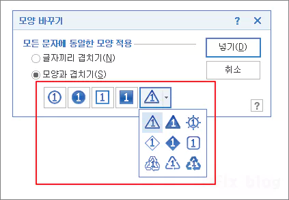옵션 창에서는 추가적으로 원형뿐만 아니라 삼각형이나 사각형 또는 전구 모양 등에도 문자를 넣어서 작성할 수 있도록 옵션 선택 기능이 있습니다.